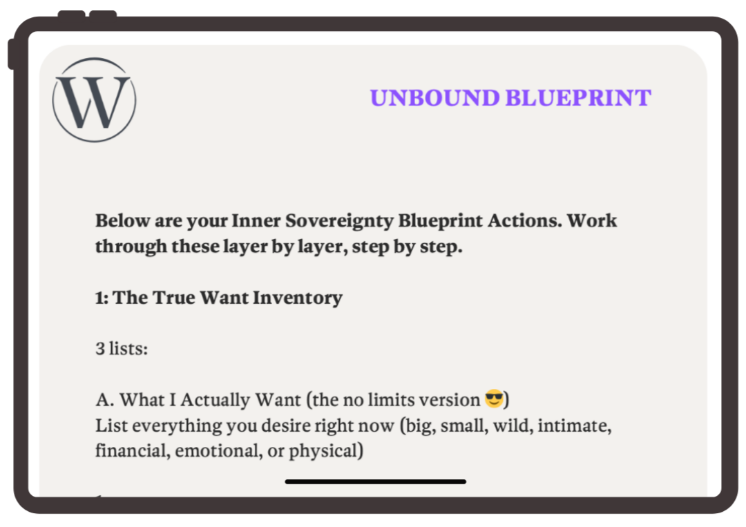 You don’t need motivation - you need simple structures and systems to create real sovereignty. The Unbound Blueprint will be your guide every step of the way.